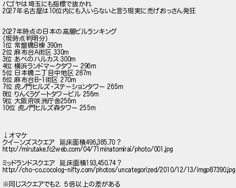 828: (SB-iPhone) [] 2018/12/04(火) 19:36:34.15 ID:0DbAODqO パゴヤは埼玉にも指標で抜かれ 2027年名古屋は10位内にも入いらないと言う現実に禿げおっさん発狂 2027年時点の日本の高層ビルランキング (現時点判明分) 1位 常盤橋B棟 390m 2位 麻布台A街区 330m 3位 あべのハルカス 300m 4位 横浜ランドマークタワー 296m 5位 日本橋二丁目中地区 287m 6位 麻布台B-1街区 270m 7位 虎ノ門ヒルズ・ステーションタワー 265m 8位 りんくうゲートタワービル 256m 9位 大阪府咲洲庁舎256m 10位 虎ノ門ヒルズ森タワー 255m ↓オマケ クイーンズスクエア 延床面積496,385.70 ? http://mirutake.fc2web.com/04/71minatomirai/photo/001.jpg ミッドランドスクエア 延床面積193,450.74 ? http://cho-co.cocolog-nifty.com/photos/uncategorized/2010/12/13/imgp87390.jpg ※同じスクエアでも2.5倍以上の差がある http://egg.5ch.net/test/read.cgi/develop/1540959778/828