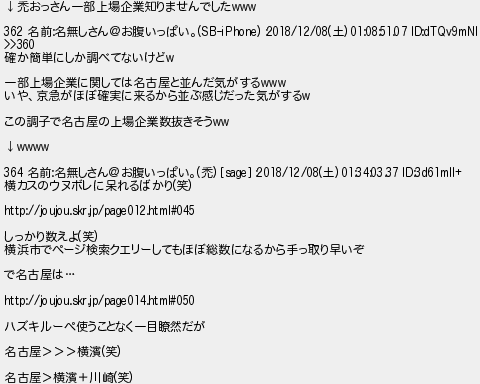 973: (SB-iPhone) [] 2018/12/08(土) 01:45:22.73 ID:xTfTKDI3 ↓禿おっさん一部上場企業知りませんでしたwww 362 名前:名無しさん@お腹いっぱい。(SB-iPhone) :2018/12/08(土) 01:08:51.07 ID:dTQv9mNl >>360 確か簡単にしか調べてないけどw 一部上場企業に関しては名古屋と並んだ気がするwww いや、京急がほぼ確実に来るから並ぶ感じだった気がするw この調子で名古屋の上場企業数抜きそうww ↓wwww 364 名前:名無しさん@お腹いっぱい。(禿) [sage] :2018/12/08(土) 01:34:03.37 ID:3d61mlI+ 横カスのウヌボレに呆れるばかり(笑) http://joujou.skr.jp/page012.html#045 しっかり数えよ(笑) 横浜市でページ検索クエリーしてもほぼ総数になるから手っ取り早いぞ で名古屋は… http://joujou.skr.jp/page014.html#050 ハズキルーペ使うことなく一目瞭然だが 名古屋>>>横濱(笑) 名古屋>横濱+川崎(笑) http://egg.5ch.net/test/read.cgi/develop/1540959778/973