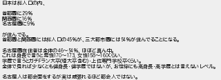 267: (東京都) [sage] 2018/11/17(土) 13:15:24.87 ID:2E+94yQ+ 日本は総人口の内、 首都圏に29% 関西圏に16% 名古屋圏に9% が住んでる。 首都圏と関西圏には総人口の45%が、三大都市圏には54%が住んでることになる。 名古屋圏在住者は全体の46〜54%、ほぼど真ん中。 これは身長で言うと男性170〜173、女性158〜160くらい、 学歴で言うとガチFラン大卒(短大卒含む)・上位専門学校卒くらい。 全体で見れば少なくとも低身長・低学歴ではないが、お世辞にも高身長・高学歴とは言えないレベル。 名古屋人は都会面をするが実は威張れるほど都会人ではない。 http://egg.5ch.io/test/read.cgi/develop/1541903199/267