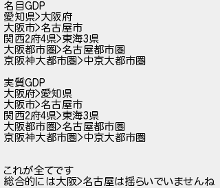 名目 愛知県大阪府 大阪市名古屋市 関西府県東海県 大阪都市圏名古屋都市圏 京阪神大都市圏中京大都市圏 実質 大阪府愛知県 大阪市名古屋市 関西府県東海県 大阪都市圏名古屋都市圏 京阪神大都市圏中京大都市圏 これが全てです 総合的には大阪名古屋は揺らいでいませんね