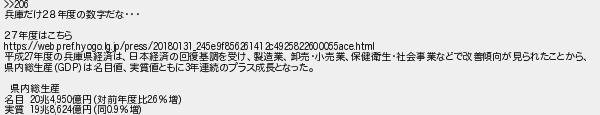 208: (やわらか銀行) [] 2018/12/04(火) 17:50:15.47 ID:fXebF5Fd >>206 兵庫だけ28年度の数字だな・・・ 27年度はこちら https://web.pref.hyogo.lg.jp/press/20180131_245e9f856261412c4925822600055ace.html 平成27年度の兵庫県経済は、日本経済の回復基調を受け、製造業、卸売・小売業、保健衛生・社会事業などで改善傾向が見られたことから、 県内総生産(GDP)は名目値、実質値ともに3年連続のプラス成長となった。 県内総生産 名目 20兆4,950億円(対前年度比2.6%増) 実質 19兆8,624億円(同0.9%増) http://egg.5ch.net/test/read.cgi/develop/1541930630/208