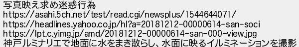 291: (チベット自治区) [sage] 2018/12/13(木) 11:39:20.98 ID:Yg9FEOhv 写真映え求め迷惑行為 https://asahi.5ch.net/test/read.cgi/newsplus/1544644071/ https://headlines.yahoo.co.jp/hl?a=20181212-00000614-san-soci https://lpt.c.yimg.jp/amd/20181212-00000614-san-000-view.jpg 神戸ルミナリエで地面に水をまき散らし、水面に映るイルミネーションを撮影 http://egg.5ch.net/test/read.cgi/develop/1541930630/291