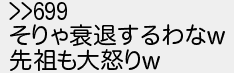 701: (兵庫県) [sage] 2019/02/03(日) 16:15:57.67 ID:yy+oNwY/ >>699 そりゃ衰退するわなw 先祖も大怒りw http://egg.5ch.io/test/read.cgi/develop/1541930630/701