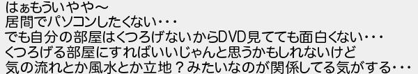 はぁもういやや 居間でパソコンしたくない でも自分の部屋はくつろげないから見てても面白くない くつろげる部屋にすればいいじゃんと思うかもしれないけど 気の流れとか風水とか立地?みたいなのが関係してる気がする