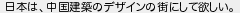 67: (京都府) [] 2021/06/23(水) 12:39:44.77 ID:Cmtvy+ui 日本は、中国建築のデザインの街にして欲しい。 http://egg.5ch.io/test/read.cgi/develop/1543356170/67