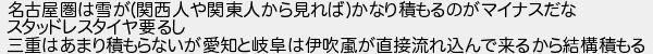 名古屋圏は雪が関西人や関東人から見ればかなり積もるのがマイナスだな スタッドレスタイヤ要るし 三重はあまり積もらないが愛知と岐阜は伊吹が直接流れ込んで来るから結構積もる