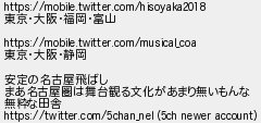53: (東京都) [sage] 2019/01/03(木) 11:57:50.19 ID:ojzxxOXj https://mobile.twitter.com/hisoyaka2018 東京・大阪・福岡・富山 https://mobile.twitter.com/musical_coa 東京・大阪・静岡 安定の名古屋飛ばし まあ名古屋圏は舞台観る文化があまり無いもんな 無粋な田舎 https://twitter.com/5chan_nel (5ch newer account) http://egg.5ch.net/test/read.cgi/develop/1546420917/53