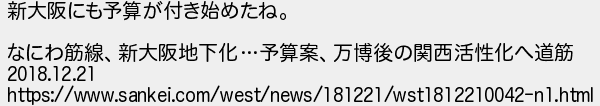 280: (やわらか銀行) [] 2019/01/09(水) 13:17:00.44 ID:2d5anUlJ 新大阪にも予算が付き始めたね。 なにわ筋線、新大阪地下化…予算案、万博後の関西活性化へ道筋 2018.12.21 https://www.sankei.com/west/news/181221/wst1812210042-n1.html http://egg.5ch.net/test/read.cgi/develop/1546770535/280