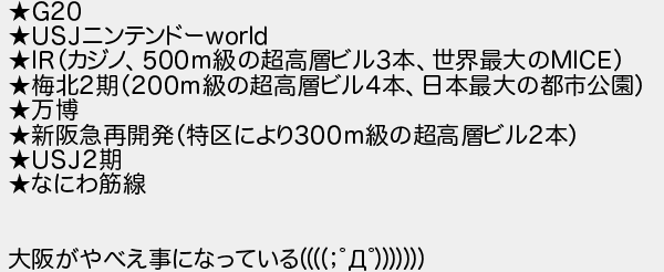 29: (滋賀県) [] 2019/01/07(月) 07:25:22.60 ID:riy1gMEz ★G20 ★USJニンテンドーworld ★IR(カジノ、500m級の超高層ビル3本、世界最大のMICE) ★梅北2期(200m級の超高層ビル4本、日本最大の都市公園) ★万博 ★新阪急再開発(特区により300m級の超高層ビル2本) ★USJ2期 ★なにわ筋線 大阪がやべえ事になっている((((;゚Д゚))))))) http://egg.5ch.net/test/read.cgi/develop/1546770535/29