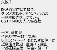 失敗? 阪急百貨店建て替え グランフロントアベノハルカス 順調に売り上げている 万人入場者数 一方愛知県 イタリア村数年で廃止 レゴランド一年も経たずに値下げ 近隣店は撤退直通バス廃止 中部国際空港関空に勝てず