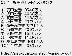 863: (禿) [] 2019/03/15(金) 21:19:59.82 ID:1bY5omno 2017年度空港利用者ランキング 1 羽田空港 8540万人 2 成田空港 4068万人 3 関西空港 2788万人 4 福岡空港 2379万人 5 新千歳空港2271万人 6 那覇空港 2097万人 7 大阪空港 1559万人 8 中部空港 1145万人 9 鹿児島空港 561万人 10仙台空港 337万人 https://mile-points.com/2017-airport-reki/ http://egg.5ch.io/test/read.cgi/develop/1551872402/863