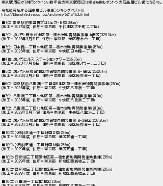 451: (東京都) [] 2019/05/03(金) 09:57:57.54 ID:8PHvvzk+ 東京駅周辺が6棟ランクイン。数年後の東京駅周辺は高さも数もダントツの超高層ビル街になるね。 令和に完成する超高層ビル高さランキングベスト10 http://bluestyle.livedoor.biz/archives/52464530.html ■1位:東京駅前常盤橋プロジェクト B棟(390m) (施工=2027年度 住所=東京都 千代田区大手町二丁目) ■2位:虎ノ門・麻布台地区第一種市街地再開発事業 A街区(325.24m) (施工=2023年3月31日 住所=東京都 港区麻布台一丁目) ■3位:日本橋一丁目中地区第一種市街地再開発事業(287m) (施工=2025年度 住所=東京都 中央区日本橋一丁目) ■4位:虎ノ門ヒルズ ステーションタワー(265.75m) (施工=2023年7月15日 住所=東京都 港区虎ノ門一、二丁目) ■5位:虎ノ門・麻布台地区市街地再開発事業 B-1街区(262.81m) (施工=2023年3月31日 住所=東京都 港区麻布台一丁目) ■6位:東京駅前八重洲一丁目東B地区第一種市街地再開発事業(250m) (施工=2025年度 住所=東京都 中央区八重洲一丁目) ■7位:八重洲二丁目中地区第一種市街地再開発事業(240m) (施工=2023年度 住所=東京都 中央区八重洲二丁目) ■7位:八重洲二丁目北地区第一種市街地再開発事業(240m) (施工=2022年8月下旬 住所=東京都 中央区八重洲二丁目) ■9位:虎ノ門・麻布台地区市街地再開発事業 B-2街区(237.20m) (施工=2023年3月31日 住所=東京都 港区麻布台一丁目) ■10位:(仮称)芝浦一丁目計画S棟(235m) (施工=2023年度 住所=東京都 港区芝浦一丁目) ■10位:(仮称)芝浦一丁目計画N棟(235m) (施工=2029年度 住所=東京都 港区芝浦一丁目) ■10位:西新宿三丁目西地区第一種市街地再開発事業北棟(235m) (施工=2029年度 住所=東京都 新宿区西新宿三丁目) ■10位:西新宿三丁目西地区第一種市街地再開発事業南棟(235m) (施工=2029年度 住所=東京都 新宿区西新宿三丁目) ■10位:八重洲一丁目北地区(235m) (施工=2030年度 住所=東京都 中央区八重洲一丁目) http://egg.5ch.net/test/read.cgi/develop/1555757421/451