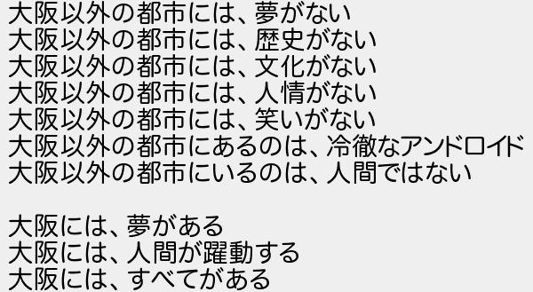 大阪以外の都市には夢がない 大阪以外の都市には歴史がない 大阪以外の都市には文化がない 大阪以外の都市には人情がない 大阪以外の都市には笑いがない 大阪以外の都市にあるのは冷徹なアンドロイド 大阪以外の都市にいるのは人間ではない 大阪には夢がある 大阪には人間が躍動する 大阪にはすべてがある