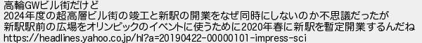 89: (東京都) [] 2019/04/23(火) 19:37:43.72 ID:rD3+r749 高輪GWビル街だけど 2024年度の超高層ビル街の竣工と新駅の開業をなぜ同時にしないのか不思議だったが 新駅駅前の広場をオリンピックのイベントに使うために2020年春に新駅を暫定開業するんだね https://headlines.yahoo.co.jp/hl?a=20190422-00000101-impress-sci http://egg.5ch.net/test/read.cgi/develop/1555757421/89