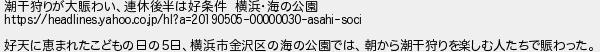 潮干狩りが大賑わい連休後半は好条件 横浜海の公園 好天に恵まれたこどもの日の5日横浜市金沢区の海の公園では朝から潮干狩りを楽しむ人たちで賑わった