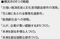 横浜市のつの戦略 力強い経済成長と文化芸術創造都市の実現 花と緑にあふれる環境先進都市 超高齢社会への挑戦 人が企業が集い躍動するまちづくり 未来を創る多様な人づくり 未来を創る強な都市づくり