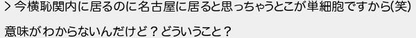 今横恥関内に居るのに名古屋に居ると思っちゃうとこが単細胞ですから笑 意味がわからないんだけど?どういうこと?