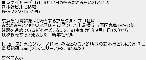 883: (神奈川県) [sage] 2019/05/22(水) 12:38:10.75 ID:45BirXi+ ■京急グループ11社,9月17日からみなとみらい21地区の 新本社ビルに移転 鉄道ファン-15 時間前 京浜急行電鉄をはじめとする京急グループ11社は, みなとみらい21中央地区56-1街区(神奈川県横浜市西区高島1-2-8)に 建設を進めている新本社ビルに,2019(令和元)年9月17日(火)から 順次移転すると発表した. 新本社ビル ... 【ニュース】 京急グループ11社、みなとみらい21地区の新本社ビルに9月17 ... 遊都総研.com (プレスリリース)-2019/05/20 すべて表示 http://egg.5ch.net/test/read.cgi/develop/1556697301/883