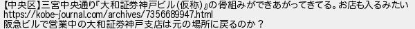 508: (SB-Android) [] 2023/04/26(水) 10:35:14.36 ID:SD5Jmi4c 【中央区】三宮中央通り『大和証券神戸ビル(仮称)』の骨組みができあがってきてる。お店も入るみたい https://kobe-journal.com/archives/7356689947.html 阪急ビルで営業中の大和証券神戸支店は元の場所に戻るのか? http://egg.5ch.net/test/read.cgi/develop/1557053532/508
