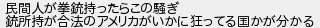 641: (庭) [] 2019/06/16(日) 21:10:45.08 ID:iG66iRBk 民間人が拳銃持ったらこの騒ぎ 銃所持が合法のアメリカがいかに狂ってる国かが分かる http://egg.5ch.net/test/read.cgi/develop/1560165357/641
