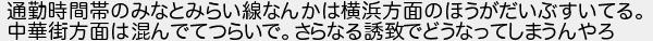 151: (光) [sage] 2019/06/21(金) 22:26:01.62 ID:b2u7el1P 通勤時間帯のみなとみらい線なんかは横浜方面のほうがだいぶすいてる。 中華街方面は混んでてつらいで。さらなる誘致でどうなってしまうんやろ http://egg.5ch.net/test/read.cgi/develop/1560410149/151