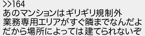 あのマンションはギリギリ規制外 業務専用エリアがすぐ隣までなんだよ だから場所によっては建てられないぞ