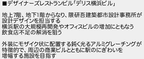 デザイナーズレストランビルデリス横浜ビル 地上階地下階からなり隈研吾建築都市設計事務所が 設計デザインを担当する 横浜駅の大規模再開発やオフィスビルの増加にともなう 飲食店不足の解消を狙う 外装にモザイク状に配置する鈍く光るアルミグレーチングが 特徴的で周辺の商業ビルとともに駅のにぎわいを 増幅する施設を目指す