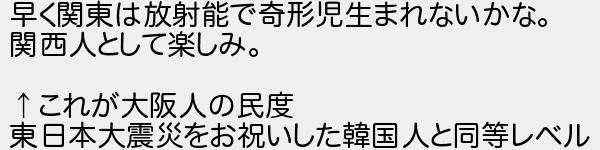 早く関東は放射能で奇形児生まれないかな 関西人として楽しみ これが大阪人の民度 東日本大震災をお祝いした韓国人と同等レベル
