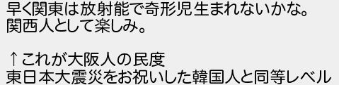 早く関東は放射能で奇形児生まれないかな 関西人として楽しみ これが大阪人の民度 東日本大震災をお祝いした韓国人と同等レベル