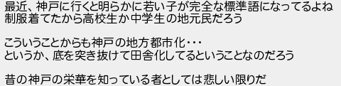 最近神戸に行くと明らかに若い子が完全な標準語になってるよね 制服着てたから高校生か中学生の地元民だろう こういうことからも神戸の地方都市化 というか底を突き抜けて田舎化してるということなのだろう 昔の神戸の栄華を知っている者としては悲しい限りだ