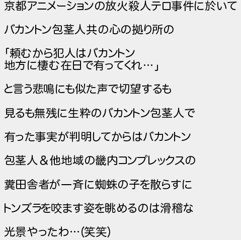 京都アニメーションの放火殺人テロ事件に於いて バカントン包茎人共の心の拠り所の 頼むから犯人はバカントン 地方に棲む在日で有ってくれ と言う悲鳴にも似た声で切望するも 見るも無残に生粋のバカントン包茎人で 有った事実が判明してからはバカントン 包茎人他地域の畿内コンプレックスの 糞田舎者が一斉に蜘の子を散らすに トンズラをます姿を眺めるのは滑稽な 光景やったわ笑笑