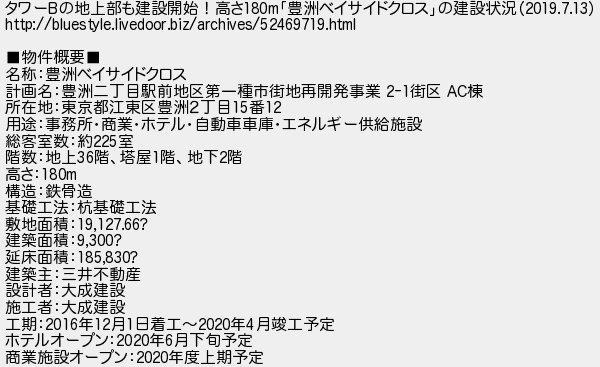 68: (光) [] 2019/08/01(木) 01:29:22.01 ID:6BVGj3dj タワーBの地上部も建設開始!高さ180m「豊洲ベイサイドクロス」の建設状況(2019.7.13) http://bluestyle.livedoor.biz/archives/52469719.html ■物件概要■ 名称:豊洲ベイサイドクロス 計画名:豊洲二丁目駅前地区第一種市街地再開発事業 2-1街区 AC棟 所在地:東京都江東区豊洲2丁目15番12 用途:事務所・商業・ホテル・自動車車庫・エネルギー供給施設 総客室数:約225室 階数:地上36階、塔屋1階、地下2階 高さ:180m 構造:鉄骨造 基礎工法:杭基礎工法 敷地面積:19,127.66? 建築面積:9,300? 延床面積:185,830? 建築主:三井不動産 設計者:大成建設 施工者:大成建設 工期:2016年12月1日着工〜2020年4月竣工予定 ホテルオープン:2020年6月下旬予定 商業施設オープン:2020年度上期予定 http://egg.5ch.net/test/read.cgi/develop/1564548415/68