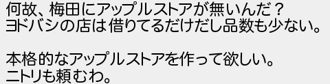 何故梅田にアップルストアが無いんだ? ヨドバシの店は借りてるだけだし品数も少ない 本格的なアップルストアを作って欲しい ニトリも頼むわ