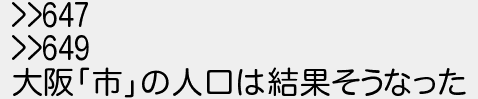 652: (東京都) [] 2019/08/20(火) 18:23:11.90 ID:TGi32j4I >>647 >>649 大阪「市」の人口は結果そうなった http://egg.5ch.io/test/read.cgi/develop/1566112291/652