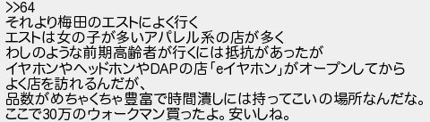 それより梅田のエストによく行く エストは女の子が多いアパレル系の店が多く わしのような前期高齢者が行くには抵抗があったが イヤホンやヘッドホンやの店イヤホンがオープンしてから よく店を訪れるんだが 品数がめちゃくちゃ豊富で時間潰しには持ってこいの場所なんだな ここで万のウォークマン買ったよ安いしね