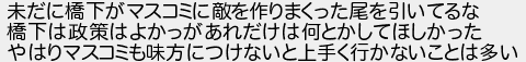 未だに橋下がマスコミに敵を作りまくった尾を引いてるな 橋下は政策はよかっがあれだけは何とかしてほしかった やはりマスコミも味方につけないと上手く行かないことは多い