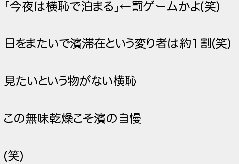 253: (埼玉県) [] 2019/09/24(火) 21:29:41.77 ID:sBt8YX// 「今夜は横恥で泊まる」←罰ゲームかよ(笑) 日をまたいで濱滞在という変り者は約1割(笑) 見たいという物がない横恥 この無味乾燥こそ濱の自慢 (笑) http://egg.5ch.net/test/read.cgi/develop/1569065014/253