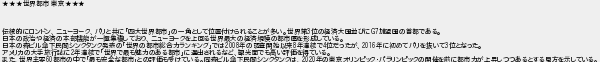 12: (東京都) [] 2019/10/18(金) 16:24:53.83 ID:d/nbwx66 ★★★世界都市 東京★★★ 伝統的にロンドン、ニューヨーク、パリと共に「四大世界都市」の一角として位置付けられることが多い。世界第3位の経済大国並びにG7加盟国の首都である。 日本の政治や経済の本部機能が一極集積しており、ニューヨークを上回る世界最大の経済規模の都市圏を形成している。 日本の森ビル傘下民間シンクタンク発表の「世界の都市総合力ランキング」では2008年の調査開始以来8年連続で4位だったが、2016年に初めてパリを抜いて3位となった。 アメリカの大手旅行誌に2年連続で「世界で最も魅力のある都市」に選出されるなど、観光面でも高い評価を得ている。 また、世界主要60都市の中で「最も安全な都市」との評価も受けている。同森ビル傘下民間シンクタンクは、2020年の東京オリンピック・パラリンピックの開催を前に都市力が上昇しつつあるとする見方を示している。 http://egg.5ch.net/test/read.cgi/develop/1571381808/12