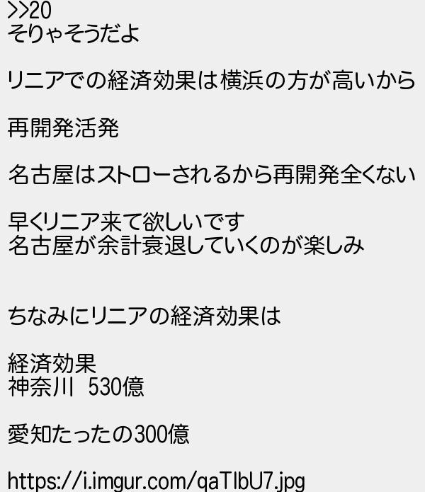 21: (東京都) [sage] 2019/11/01(金) 21:19:43.42 ID:+kN5ziXJ >>20 そりゃそうだよ リニアでの経済効果は横浜の方が高いから 再開発活発 名古屋はストローされるから再開発全くない 早くリニア来て欲しいです 名古屋が余計衰退していくのが楽しみ ちなみにリニアの経済効果は 経済効果 神奈川 530億 愛知たったの300億 https://i.imgur.com/qaTIbU7.jpg http://egg.5ch.net/test/read.cgi/develop/1572589749/21