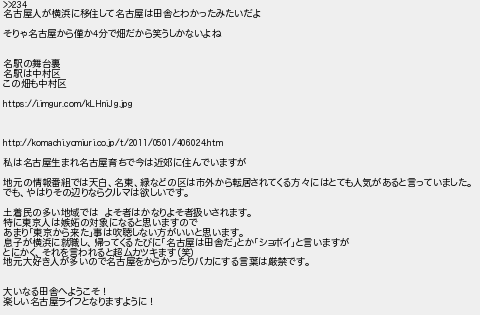 236: (東京都) [] 2019/11/06(水) 17:44:26.20 ID:ZQ4ZMDoI >>234 名古屋人が横浜に移住して名古屋は田舎とわかったみたいだよ そりゃ名古屋から僅か4分で畑だから笑うしかないよね 名駅の舞台裏 名駅は中村区 この畑も中村区 https://i.imgur.com/kLHniJg.jpg http://komachi.yomiuri.co.jp/t/2011/0501/406024.htm 私は名古屋生まれ名古屋育ちで今は近郊に住んでいますが 地元の情報番組では天白、名東、緑などの区は市外から転居されてくる方々にはとても人気があると言っていました。 でも、やはりその辺りならクルマは欲しいです。 土着民の多い地域では よそ者はかなりよそ者扱いされます。 特に東京人は嫉妬の対象になると思いますので あまり「東京から来た」事は吹聴しない方がいいと思います。 息子が横浜に就職し、帰ってくるたびに「名古屋は田舎だ」とか「ショボイ」と言いますが とにかく、それを言われると超ムカツキます(笑) 地元大好き人が多いので名古屋をからかったりバカにする言葉は厳禁です。 大いなる田舎へようこそ! 楽しい名古屋ライフとなりますように! http://egg.5ch.net/test/read.cgi/develop/1572589749/236