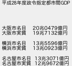 354: (庭) [] 2019/11/11(月) 00:59:23.30 ID:AGn9cnS1 平成28年度政令指定都市間GDP 大阪市名目 20兆0479億円 大阪市実質 19兆7132億円 横浜市名目 13兆5596億円 横浜市実質 13兆0923億円 名古屋市名目 13兆3071億円 名古屋市実質 12兆9672億円 http://egg.5ch.net/test/read.cgi/develop/1572589749/354