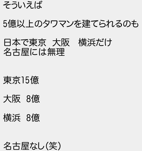 そういえば 億以上のタワマンを建てられるのも 日本で東京 大阪 横浜だけ 名古屋には無理 東京億 大阪 億 横浜 億 名古屋なし笑
