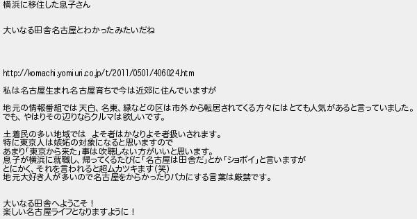 714: (神奈川県) [] 2019/11/15(金) 20:31:31.10 ID:LMMF0q8Y 横浜に移住した息子さん 大いなる田舎名古屋とわかったみたいだね http://komachi.yomiuri.co.jp/t/2011/0501/406024.htm 私は名古屋生まれ名古屋育ちで今は近郊に住んでいますが 地元の情報番組では天白、名東、緑などの区は市外から転居されてくる方々にはとても人気があると言っていました。 でも、やはりその辺りならクルマは欲しいです。 土着民の多い地域では よそ者はかなりよそ者扱いされます。 特に東京人は嫉妬の対象になると思いますので あまり「東京から来た」事は吹聴しない方がいいと思います。 息子が横浜に就職し、帰ってくるたびに「名古屋は田舎だ」とか「ショボイ」と言いますが とにかく、それを言われると超ムカツキます(笑) 地元大好き人が多いので名古屋をからかったりバカにする言葉は厳禁です。 大いなる田舎へようこそ! 楽しい名古屋ライフとなりますように! http://egg.5ch.net/test/read.cgi/develop/1572589749/714