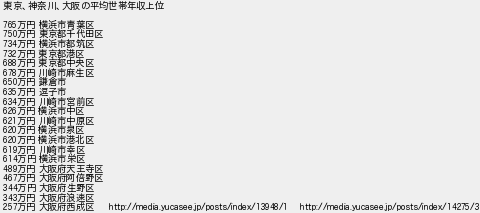 175: (神奈川県) [] 2020/02/02(日) 17:05:36.62 ID:X3/LSlh6 東京、神奈川、大阪の平均世帯年収上位 765万円 横浜市青葉区 750万円 東京都千代田区 734万円 横浜市都筑区 732万円 東京都港区 688万円 東京都中央区 678万円 川崎市麻生区 650万円 鎌倉市 635万円 逗子市 634万円 川崎市宮前区 626万円 横浜市中区 621万円 川崎市中原区 620万円 横浜市泉区 620万円 横浜市港北区 619万円 川崎市幸区 614万円 横浜市栄区 489万円 大阪府天王寺区 467万円 大阪府阿倍野区 344万円 大阪府生野区 343万円 大阪府浪速区 257万円 大阪府西成区 http://media.yucasee.jp/posts/index/13948/1 http://media.yucasee.jp/posts/index/14275/3 http://egg.5ch.io/test/read.cgi/develop/1580209907/175
