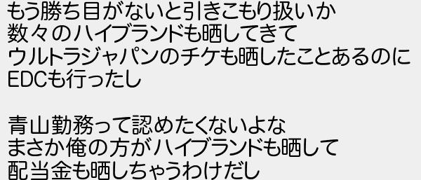 もう勝ち目がないと引きこもり扱いか 数のハイブランドも晒してきて ウルトラジャパンのチケも晒したことあるのに も行ったし 青山勤務って認めたくないよな まさか俺の方がハイブランドも晒して 配当金も晒しちゃうわけだし