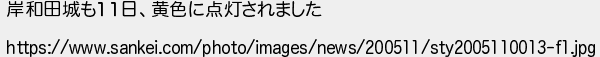 653: (東京都) [] 2020/05/12(火) 04:39:28 ID:d/n5wamb 岸和田城も11日、黄色に点灯されました https://www.sankei.com/photo/images/news/200511/sty2005110013-f1.jpg http://egg.5ch.net/test/read.cgi/develop/1588338460/653