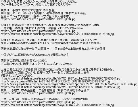 283: (東京都) [] 2021/03/16(火) 09:21:22.19 ID:pY6TN07B 中国ジジイは頭悪いからスケールの違いを理解してないんだな。 スケールわかるか?スケールを合わせて比較するんだぞw 東京は山手線エリアだけでも世界1の大都会。 1000億円オーバーのハイテク高層ビルばかりの高層ビル群が沢山ある。 世界一のハイテク高層ビル群のハイテク巨大摩天楼都市。 https://fsarc.info/wp-content/uploads/2019/11/DSC_0034.jpg 中国1の都会www上海の安物高層ビルが10棟程度のショボい小さな高層ビル群が 上海で唯一の高層ビル群で上海で唯一の都会っぽいエリアなwwww https://fsarc.info/wp-content/uploads/2019/11/DSC_0040.jpg https://cdn-ak.f.st-hatena.com/images/fotolife/a/aya-TERASS/20191015/20191015183716.jpg 中国1の都会www上海で唯一の高層ビル群で上海で唯一の都会っぽいエリアが 東京に沢山ある高層ビル群の僅か1エリアの西新宿高層ビル群の半分以下の面積。 西新宿高層ビル群の半分以下の面積 = 中国1の都会w上海の都市エリア全ての面積 中国ジジイよ。圧倒的な差があるのをこれで理解したか? 西新宿の周辺は都会が果てしなく続く。 ボロ家バラック村、低層ボロアパート村のスプロールは無い。 上海の都会エリアは半径200Mに安物ボロビルが数える程度の小さな高層ビル群が1か所のみ。 その周辺はボロ家バラック村、低層ボロアパート村のザ貧乏発展途上国の ド田舎村スプロールが続く。 https://cdn-ak.f.st-hatena.com/images/fotolife/W/W201903Youtube/20200728/20200728085344.jpg http://j.people.com.cn/NMediaFile/2016/0421/FOREIGN201604211602000438361901517.jpg http:///www.peoplechina.com.cn/xinwen/images/attachement/jpg/site125/20170112/7427eaf29e9819e1815802.jpg https://cdn-ak.f.st-hatena.com/images/fotolife/W/W201903Youtube/20200721/20200721055049.jpg 東京 山手線エリアの画像右下の西新宿高層ビル群の半分以下の面積が https://fsarc.info/wp-content/uploads/2019/11/DSC_0034.jpg 上海 中国1の一極集中の都会www上海の都市エリア全ての面積と同じ https://fsarc.info/wp-content/uploads/2019/11/DSC_0040.jpg https://cdn-ak.f.st-hatena.com/images/fotolife/a/aya-TERASS/20191015/20191015183716.jpg http://egg.5ch.net/test/read.cgi/develop/1589953776/283
