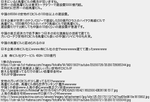 385: (東京都) [] 2021/06/05(土) 21:44:46.76 ID:Lf50jWtg 日本にいると高層ビルの概念が狂いますね。 世界一の超高層ビルは東京トーチタワーで建設費5000憶円超。 圧倒的に世界一の超高層ビル。 中国の600Mの安物ボロビルの100倍以上の建設費。 日本企業が世界1のテクノロジーで建設した500億円クラスのハイテク高級ビルで 高層ビル、1000億円クラスのハイテク高級ビルで超高層ビル。 建設費だけで比較しても中国の10倍くらいの建設費が普通です。 中国の貧乏経済力で低予算かつ日本の劣化猿真似の技術で建てた 汚いローテク安物ボロビルを高層ビル扱いの中国ジジイに今日も失笑。 中国の高層ビルと認められるのは 日本企業の森ビル社にwwww森ビル社の金でwwwwwww建てて貰ったwwwwww 上海 森ビル社タワービル 492m 1200億円 1棟のみwwww https://cdn-ak.f.st-hatena.com/images/fotolife/W/W201903Youtube/20200728/20200728085344.jpg それ以外は貧乏発展途上国らしい汚い安物ボロビルが 数える程度建ってるだけの貧しい低層田舎村w それが中国wwww 安物の汚いボロビルが少し建ってるだけwwwww 高層ビルの数、高層ビル群も世界ランキング圏外wwwww 中国1の都会www上海の都心www貧乏クソ田舎wwwwww ttp://j.people.com.cn/NMediaFile/2016/0421/FOREIGN201604211602000438361901517.jpg 上海の高級住宅街wwwwwボロ家バラック村wwwww http:///www.peoplechina.com.cn/xinwen/images/attachement/jpg/site125/20170112/7427eaf29e9819e1815802.jpg https://cdn-ak.f.st-hatena.com/images/fotolife/W/W201903Youtube/20200721/20200721055049.jpg http://egg.5ch.net/test/read.cgi/develop/1589953776/385