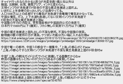 チャイナ行ったなら分かると思うが共産党員億人位以外は 韓国北朝鮮台湾東南アジアインドと変わらん 文明インフラが未発達でド田舎の不潔な貧乏発展途上国だよ いまだに上半身裸のおっさんがレジ店員やってる 人口万以上の成都ですら電気が未発達で発電機で電気まかなってる 中国は電気ガス上下水道も発達してない文明インフラが未発達で ド田舎の不潔な貧乏発展途上国 中国猿の平均の月収は李克強首相が中国政府公式の発表で 日本円で円以下爆笑フカシ無しの実測で万円以下爆笑 中国の貧乏発展途上国丸出しの不潔な便所不潔な中国猿の現実 動物園の獣の便所の方が清潔ケツ拭いた紙は汚い箱に入れる仕様 中国で唯一の都市中国1の都会で一極集中上海の都心がこれ 上海の都心ですら文明インフラが未発達で不潔な貧乏発展途上国のド田舎村 中国上海の観光ガイド公式サイトに掲載してる画像だからな 野良の画像はもっと汚いのがゴロゴロあるから検索してみ 貧乏ド田舎発展途上国を公開処刑する中国上海の観光ガイド公式サイト