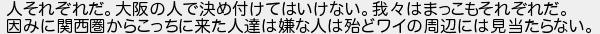 人それぞれだ大阪の人で決め付けてはいけない我はまっこもそれぞれだ 因みに関西圏からこっちに来た人達は嫌な人は殆どワイの周辺には見当たらない